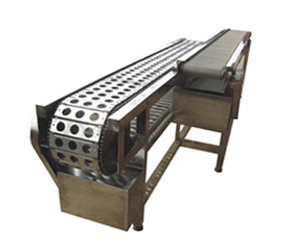 板块式输送机是将冰淇淋外包装盒装放在输送机板块孔内,使其口面向上整齐的缓慢向前输送,其速度和冰淇淋机的速度相吻合,除此之外也可用作输送其他物品。
